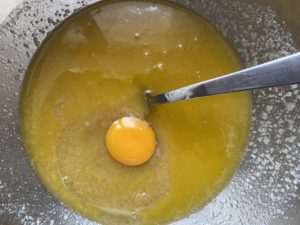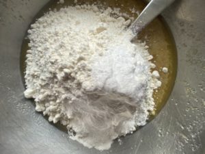 - Quand le tout est bien incorporé, versez la farine et la levure.