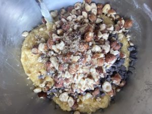 - Continuez de mélanger. Dès que le tout s’homogénéise, ajoutez le chocolat et les noisettes.