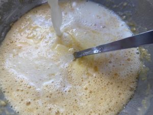 - Ajoutez la farine, le beurre fondu puis le lait.