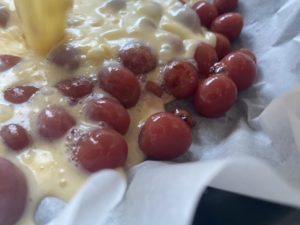 - Dans un plat à clafoutis, disposez les cerises égouttées puis versez la préparation.