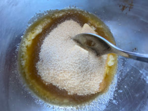 - Faire fondre le beurre demi-sel, ajouter le sucre blond et la vanille.