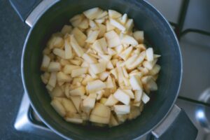 - Éplucher et découper en morceaux les pommes.