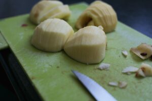- Pendant que la compote cuit, éplucher et couper en quatre les deux dernières pommes, puis, couper les quartiers en fines lamelles (elles serviront à être posées sur la compote).